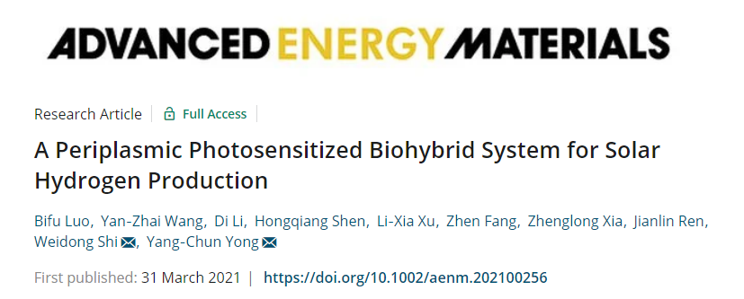 施伟东教授团队合作在Advanced Energy Materials杂志上发表最新研究成果“A periplasmic photosensitized biohybrid system for solar hydrogen production”。