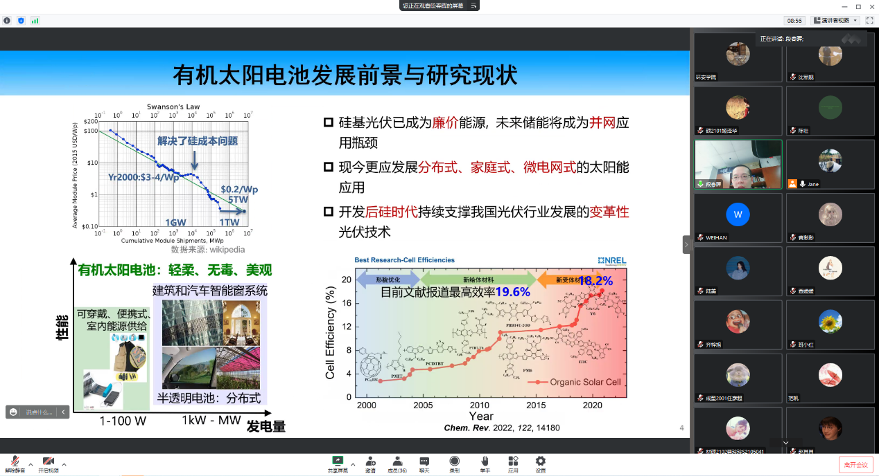 段教授从有机太阳电池发展的前景、研究现状、面临挑战、制备关键技术等方面进行了详细报告。介绍了课题组近五年来在光伏材料设计方面的重大突破:多次创造聚噻吩太阳电池的世界纪录效率,持续引领聚噻吩光伏材料的发展;开发了B-N稠环、氰基噻吩、线性D-A聚合物、非稠合聚合物受体等多个原创性的高性能低成本给/受体材料体系,推动了线性D–A光伏有机聚合物的复兴;提出了多重共振有机光伏材料的学术思想,为有机太阳电池实现效率突破提供了新的思路;并于近期设计开发了“近紫外-近红外搭配”的新策略用于制备彩色半透明有机光伏器件。段春晖教授讲座内容深入浅出,丰富易懂,并与会师生进行了深入交流和热烈讨论。
