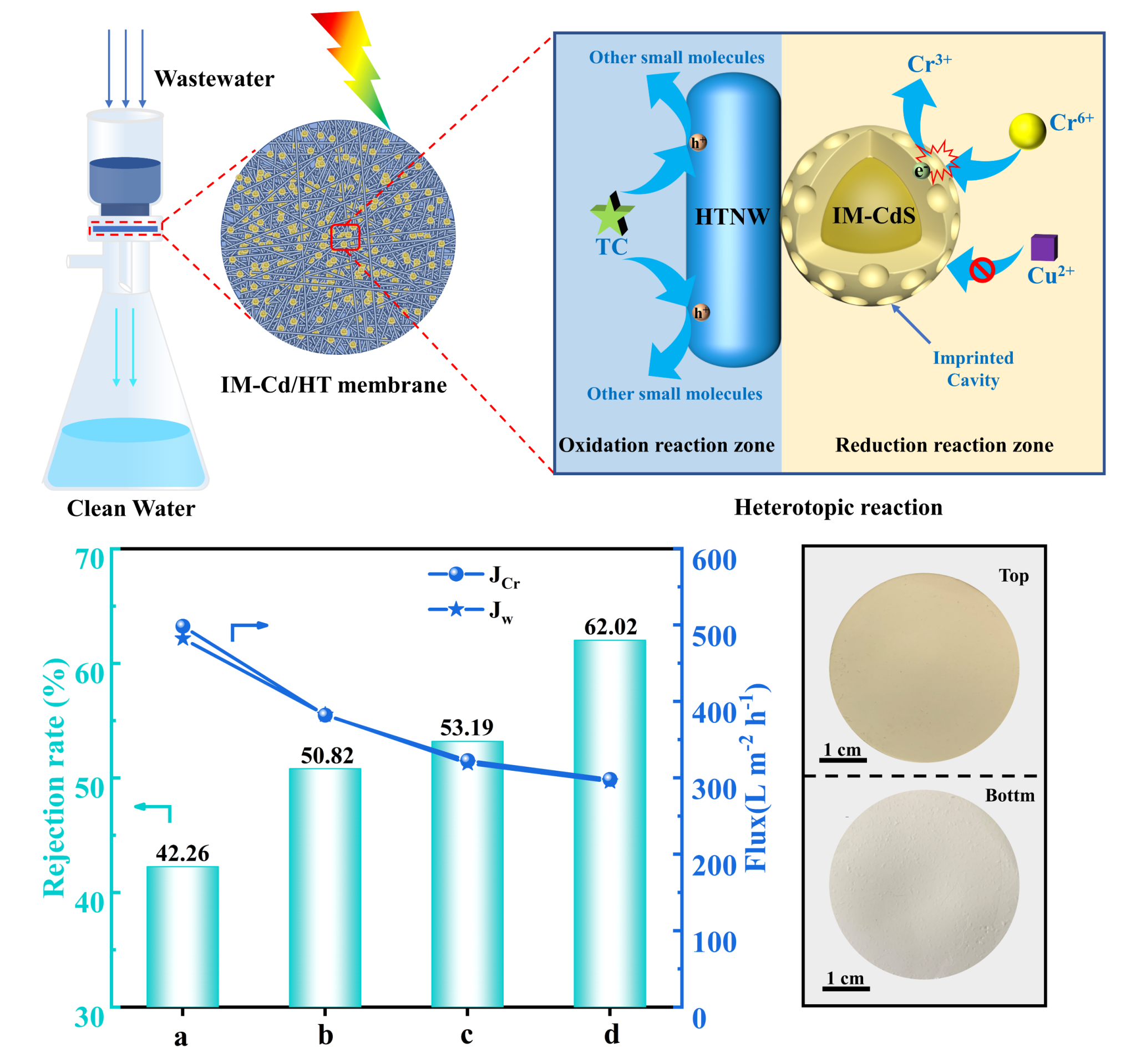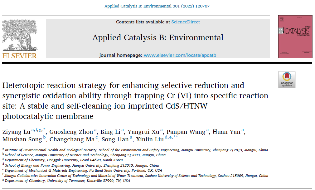 近日,AV片逯子扬副研究员在环境领域顶级学术期刊Applied Catalysis B: Environmental(影响因子:19.503,一区,Top期刊)上在线发表题为 “Heterotopic reaction strategy for enhancing selective reduction and synergistic oxidation ability through trapping Cr (VI) into specific reaction site: A stable and self-cleaning ion imprinted CdS/HTNW photocatalytic membrane”的研究论文。AV片