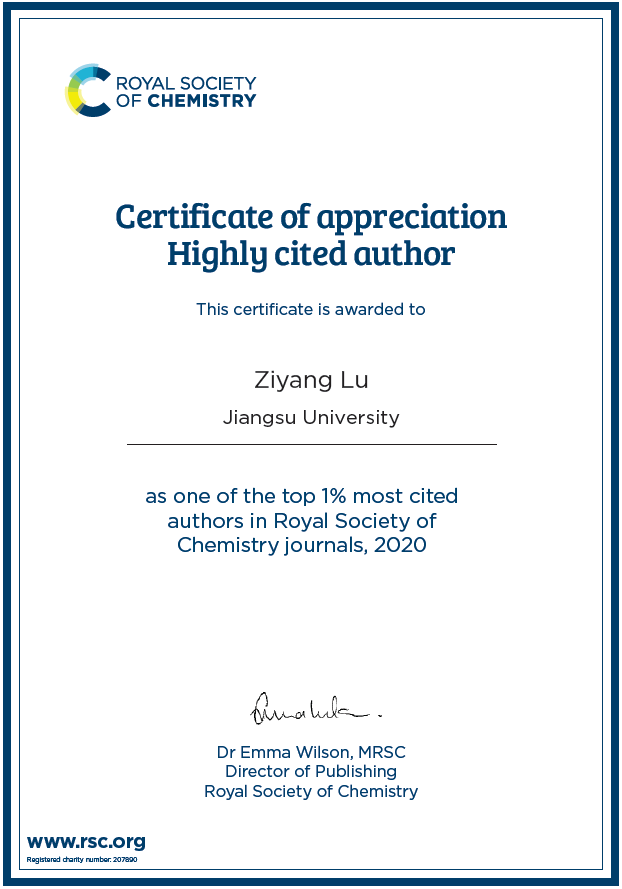 英国皇家化学会于1841年成立于伦敦,在国际学术交流、主办期刊、会议、科学研究、教育以及向公众传播科学知识等领域享有盛誉。英国皇家化学会出版的期刊多数被SCI收录,是学术研究的重要信息来源。为彰显作者对研究领域的突出贡献,英国皇家化学会对旗下四十多本期刊发表论文的引用情况进行统计,将2018、2019年发表的论文在2020年的被引次数在全球排名前1%的名单进行了筛选,这也是AV片教师首次入选RSC Top 1%高被引作者。