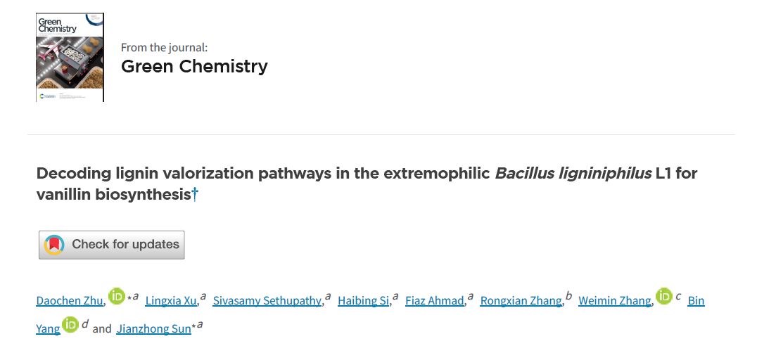 近日,AV片朱道辰研究员和孙建中教授团队关于木质素解聚合成香草醛方面的研究取得重要进展。相关成果以“Decoding lignin valorization pathways in the extremophilic Bacillus ligniniphilus L1 for vanillin biosynthesis”为题,发表于绿色可持续发展领域国际著名期刊《Green Chemistry》。