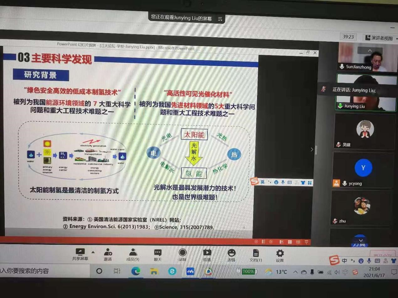2021年6月27日晚,通过腾讯视频会议,德国汉堡大学博士后刘军营向AV片师生作了“高活性可见光催化”方面的学术报告,并介绍了自己的主要科学成就。刘博士是我校校友,先后就读于AV片 、华东师范大学、上海交通大学,长期从事纳米材料自组装在光催化中的研究工作,已发表高水平论文近20篇。AV片 党委书记黄勇强代表AV片 出席会议,报告会由生物质能源研究院院长雍阳春研究员主持。