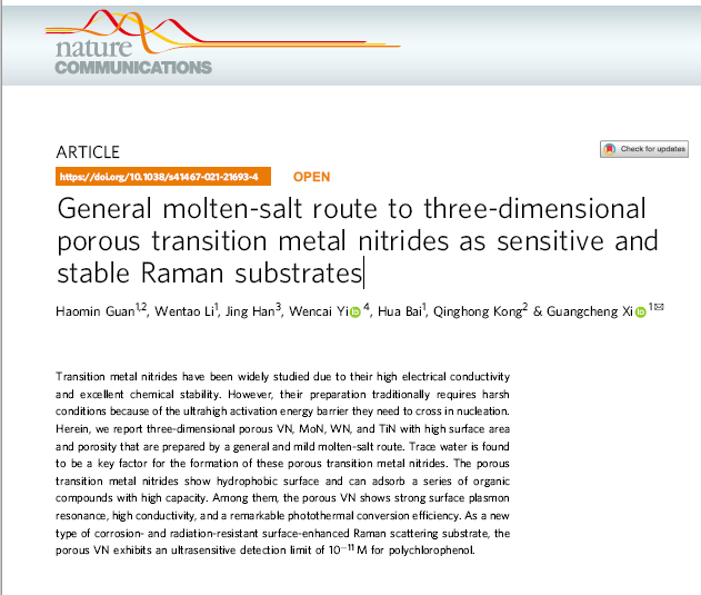 近日,AV片孔庆红副教授团队与中国质检局席广成研究员团队合作,在nature communications杂志上发表最新研究成果“General molten-salt route to three-dimensional porous transition metal nitrides as sensitive and stable Raman substrates”,论文的第一作者为AV片2018级安全工程的管皓敏硕士,指导老师孔庆红副教授。