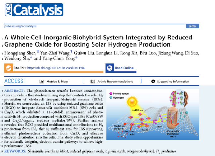 施伟东教授团队合作在ACS Catalysis杂志上发表最新研究成果“A Whole-Cell Inorganic-Biohybrid System Integrated by Reduced Graphene Oxide for Boosting Solar Hydrogen Production”。