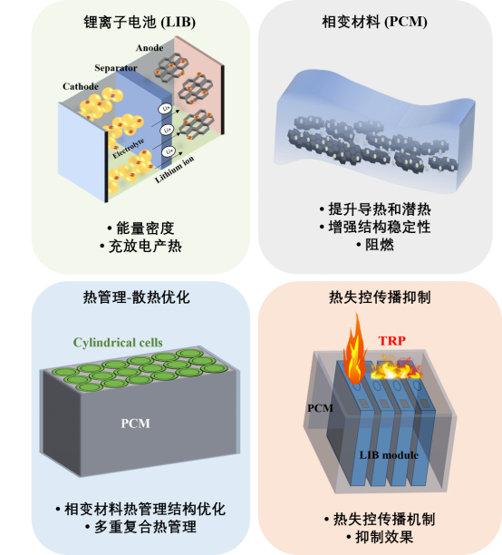 文章通过综述已有的研究成果,论证了相变材料作为电池热管理系统的可行性和未来方向。文章指出了相变材料中碳基添加剂的优势,介绍了添加聚合物和纳米材料可以改善相变材料的结构稳定性和力学性能,重点讨论了相变材料散热优化和热失控传播抑制的挑战。