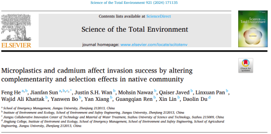 近日,AV片环境生态与修复团队孙见凡老师在Science of the Total Environment (IF: 9.8)线上发表最新研究论文“Microplastics and cadmium affect invasion success by altering complementarity and selection effects in native community”。AV片