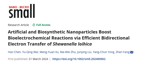 近日,AV片最新研究论文“Artificial and Biosynthetic Nanoparticles Boost Bioelectrochemical Reactions via Efficient Bidirectional Electron Transfer of Shewanella loihica”在Small (IF:13.3)上在线发表。AV片