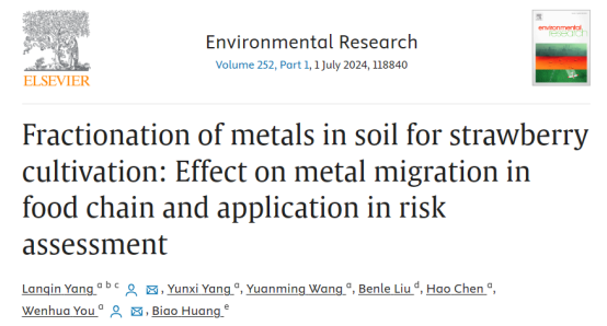 近日,AV片最新研究论文“Fractionation of metals in soil for strawberry cultivation: Effect on metal migration in food chain and application in risk assessment”在Environmental Research (IF: 8.3)上在线发表。AV片