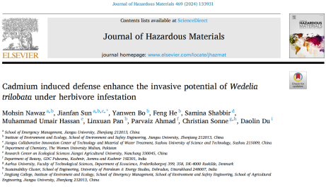 近日,AV片环境生态与修复团队孙见凡老师在Journal of Hazardous Materials (IF: 13.6)上发表最新研究成果“Cadmium induced defense enhance the invasive potential of Wedelia trilobata under herbivore infestation”。AV片