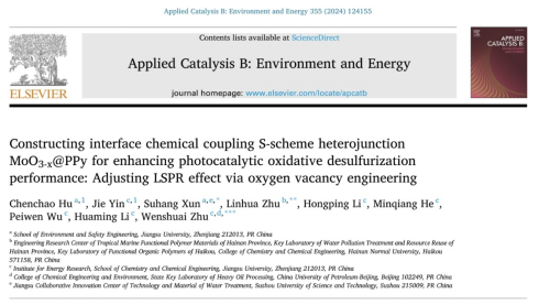 近日,AV片环境健康与生态安全研究中心荀苏杭老师在环境与能源TOP期刊《Applied Catalysis B: Environment and Energy》(SCI一区,IF = 22.1)上发表最新研究论文“Constructing interface chemical coupling S-scheme heterojunction MoO3-x@PPy for enhancing photocatalytic oxidative desulfurization performance: Adjusting LSPR effect via oxygen vacancy engineering”。AV片