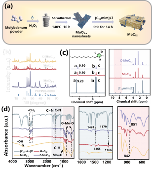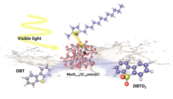 该工作通过咪唑类离子液体[C12mim]Cl对MoO3-x进行表面修饰,构建了氢键界面耦合结构。这种结构不仅作为电子转移通道,还有效抑制了光生电子-空穴对的复合。实验结果显示,在可见光照射下,经过[C12mim]Cl修饰的MoO3-x(记为MoC12)光催化剂在60分钟内实现了96.6%的深度脱硫效率,并且在7个循环中表现出优异的稳定性。此外,氧空位的形成提升了其表面自由载流子浓度,对光催化脱硫起到了积极作用。该研究通过缺陷工程和表面修饰相结合的方法,为提高光催化脱硫效率提供了新的视角。这种改性策略不仅适用于柴油脱硫,也为其他光催化应用提供了参考。