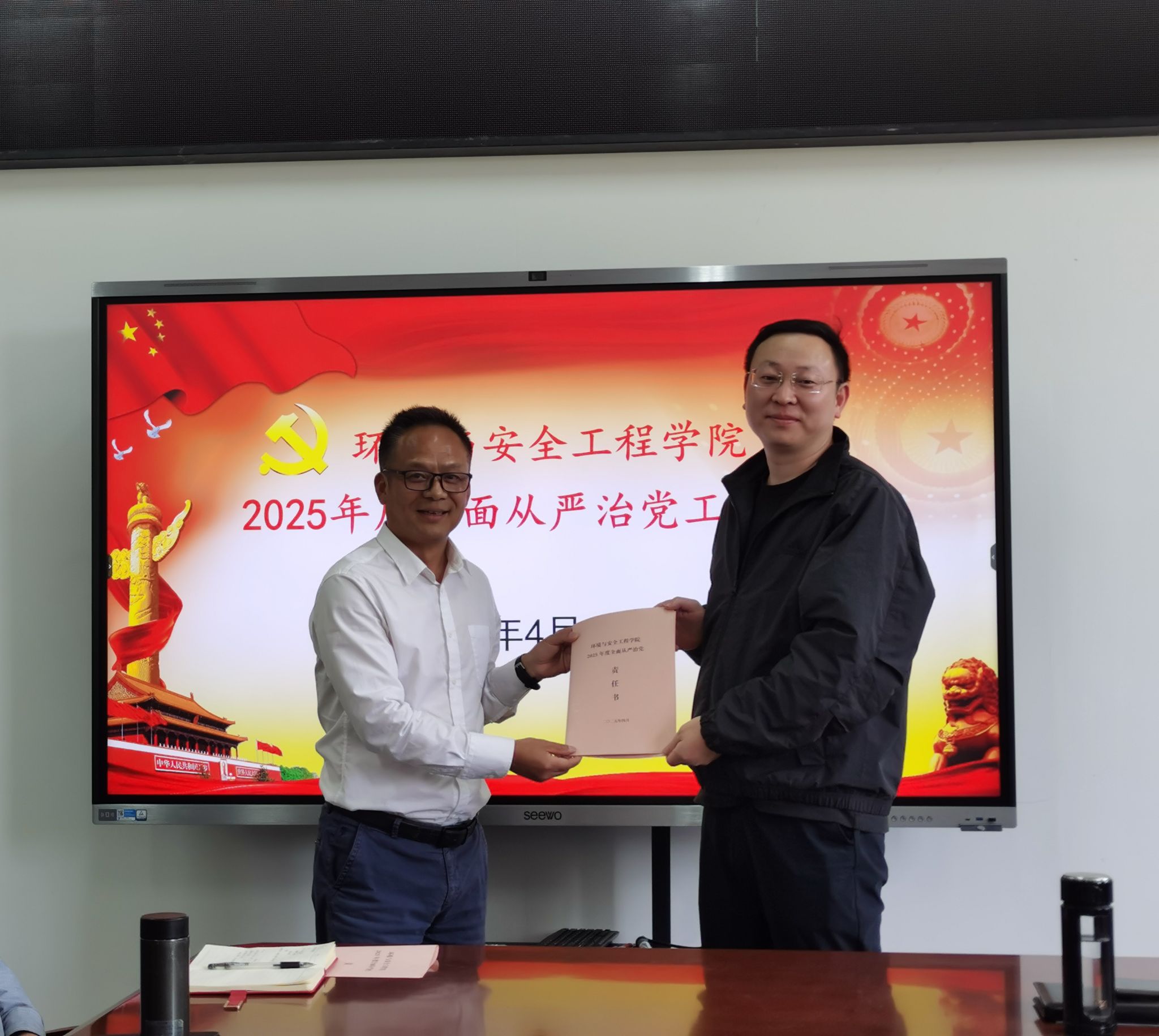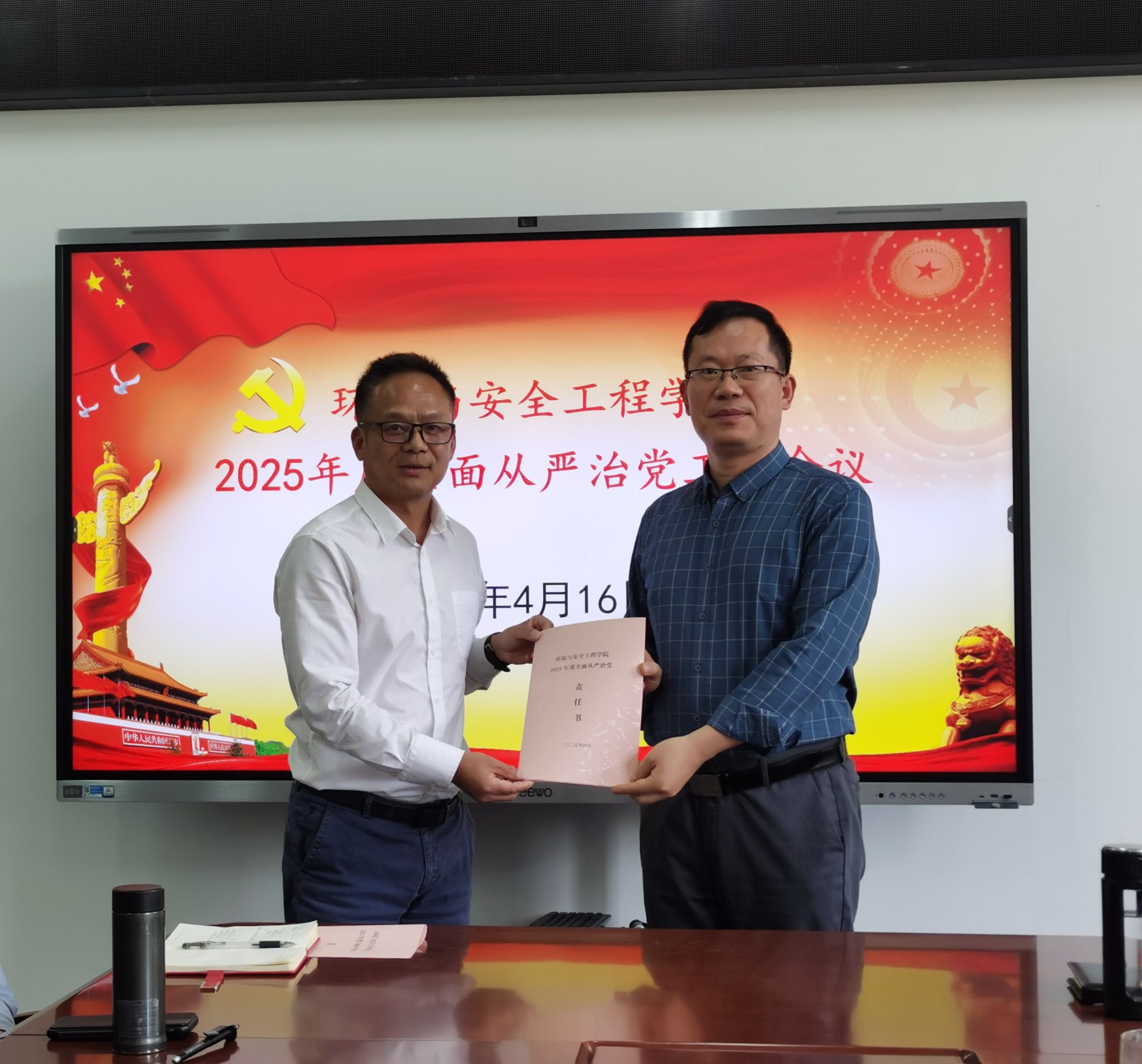 会上,领导班子成员、教职工党支部书记代表向院党委递交了2025年度全面从严治党责任书。会前,集中观看警示教育片《铁规矩硬杠杠》。