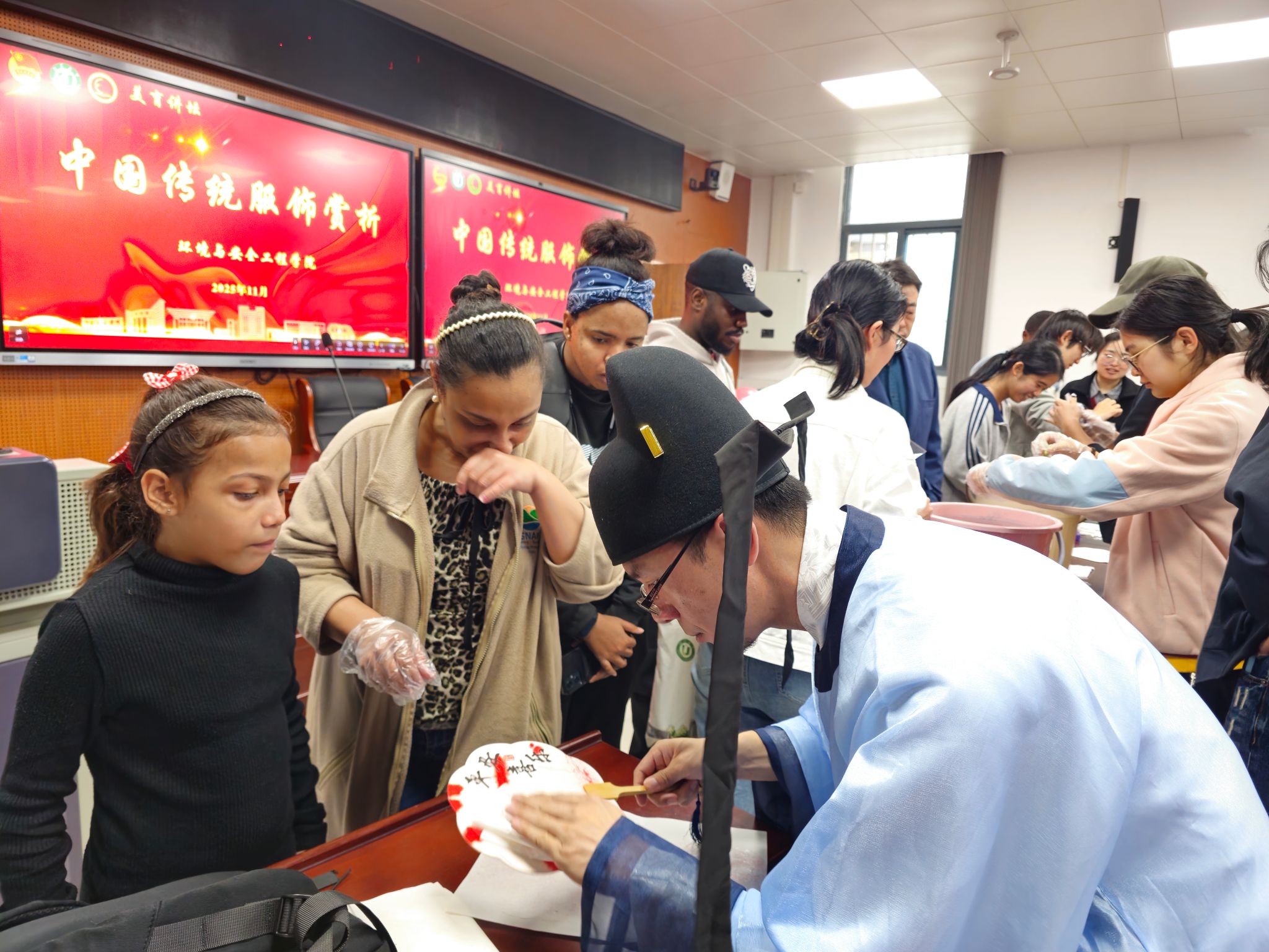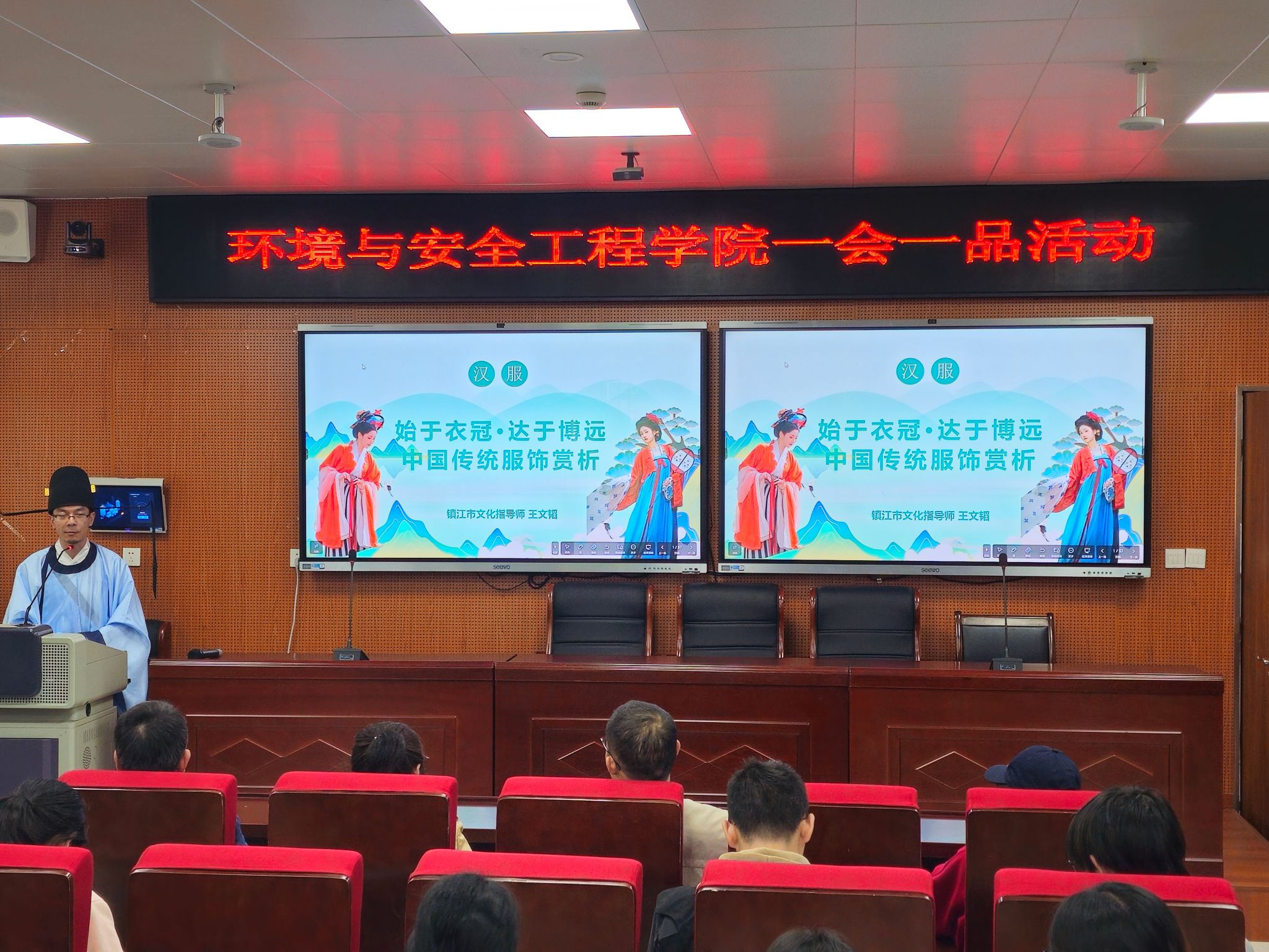 团委联合学院工会在学院楼118报告厅举办“始于衣冠,达于博远——中国传统服饰赏析”美育讲坛,本次活动邀请到江苏吉藏文化创意产业发展有限公司总经理王文韬担任主讲人。活动由工会主席郑敏学主持,90余名中外学生参加了活动。
