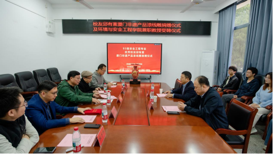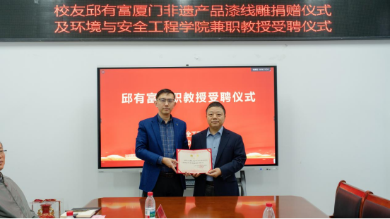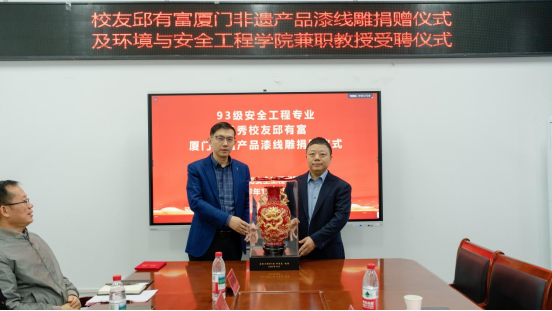 在环安楼310会议室隆重举行校友邱有富厦门非遗产品漆线雕(红五龙双耳凤尾瓶)捐赠仪式暨兼职教授受聘仪式。学院93级安全工程专业校友邱有富、欧芳明,AV片